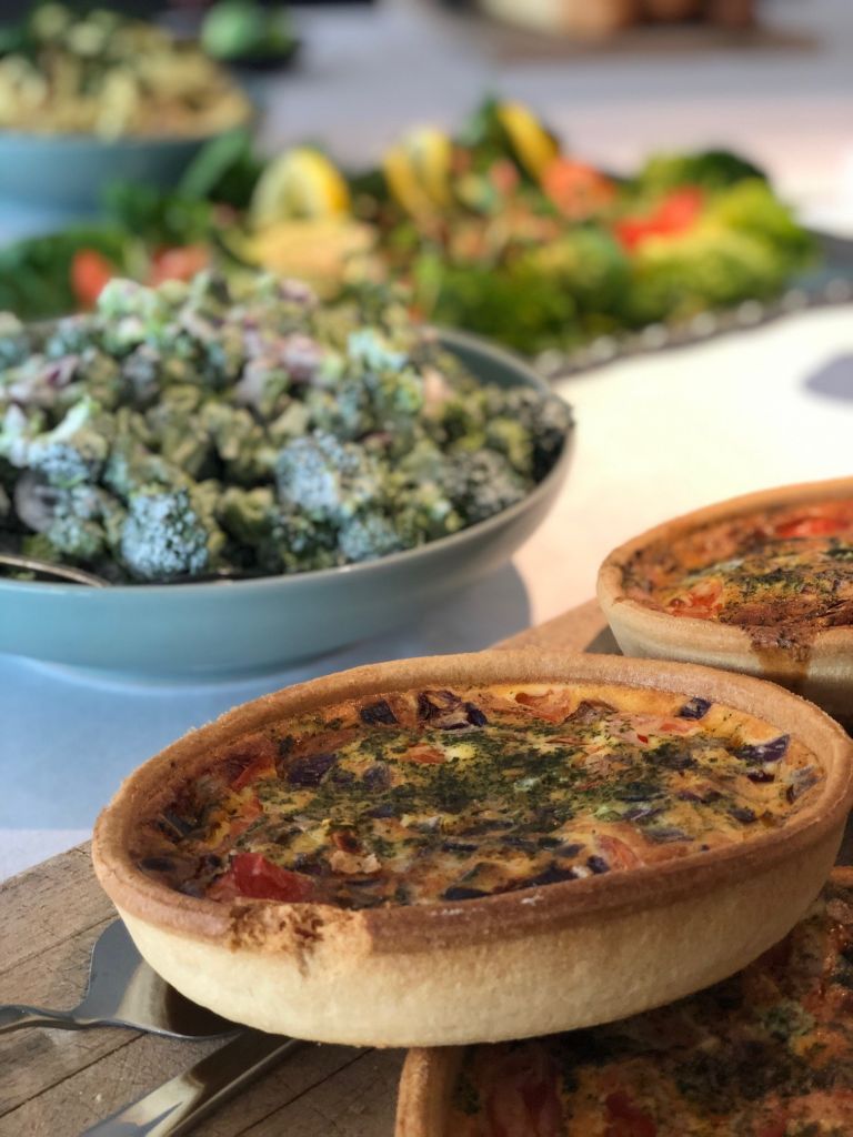 Laks Bellevue med rejer Pastasalat med kylling Tærter Tomatsalat Melonsalat med feta og mynte Kylling suprime Kalveculotte med petitkartofler og rødvinssovs Frugt og kage 325,- pr. person Kontakt Os